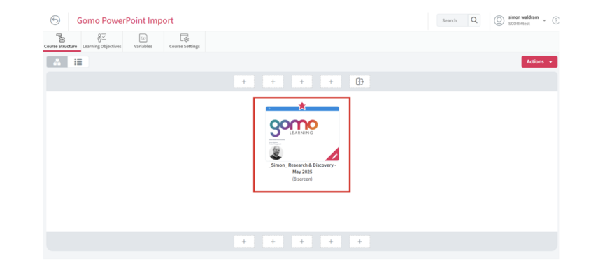 The PowerPoint import feature allows for rapid slide deck uploads. Each slide can be imported as an individual screen, with all content being retained. Gomo intelligently separates all the text, images, videos, and audio from the slide deck into different elements. This enables learning designers to apply the full spectrum of Gomo features—including interactivity and AI-powered translation—to each element.